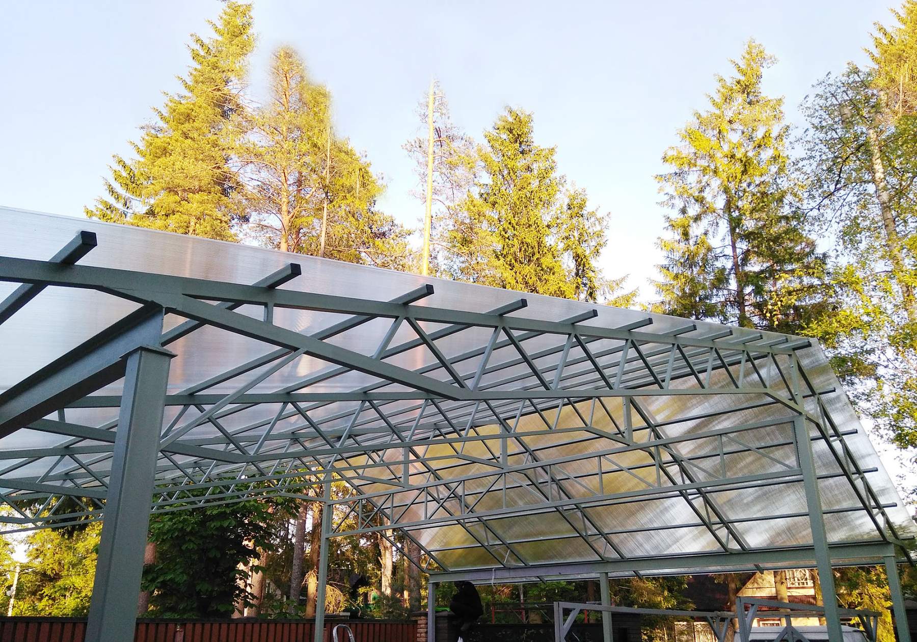 Чаще всего мы используем сотовый или монолитный поликарбонат, так как он долговечен и хорошо пропускает свет. Также изготавливаем навесы из профнастила (металлопрофиля), металлочерепицы и мягкой кровли — выбор зависит от ваших пожеланий и дизайна.