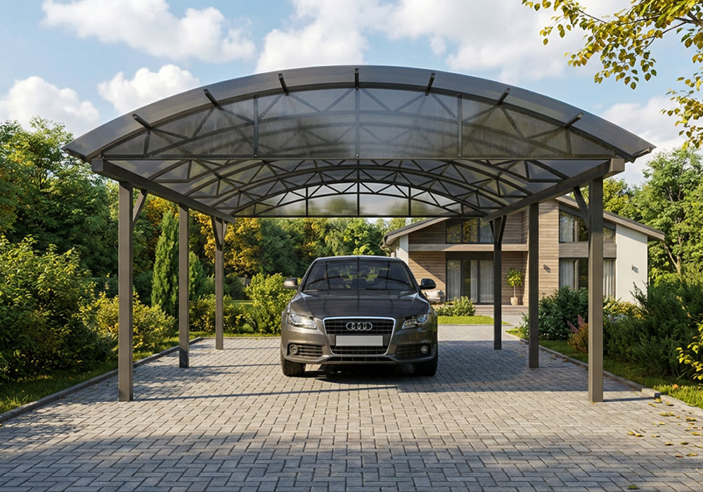 В отличие от "глухого" профнастила, сотовый или монолитный поликарбонат сохраняет естественную освещенность на участке. Это критически важно, если навес примыкает к окнам дома или находится в затененной зоне. Мы используем только качественные пластики с UV-защитой (от 40 мкм), которые блокируют вредный ультрафиолет, защищая краску автомобиля от выгорания, но оставляя пространство светлым и "легким" для визуального восприятия.